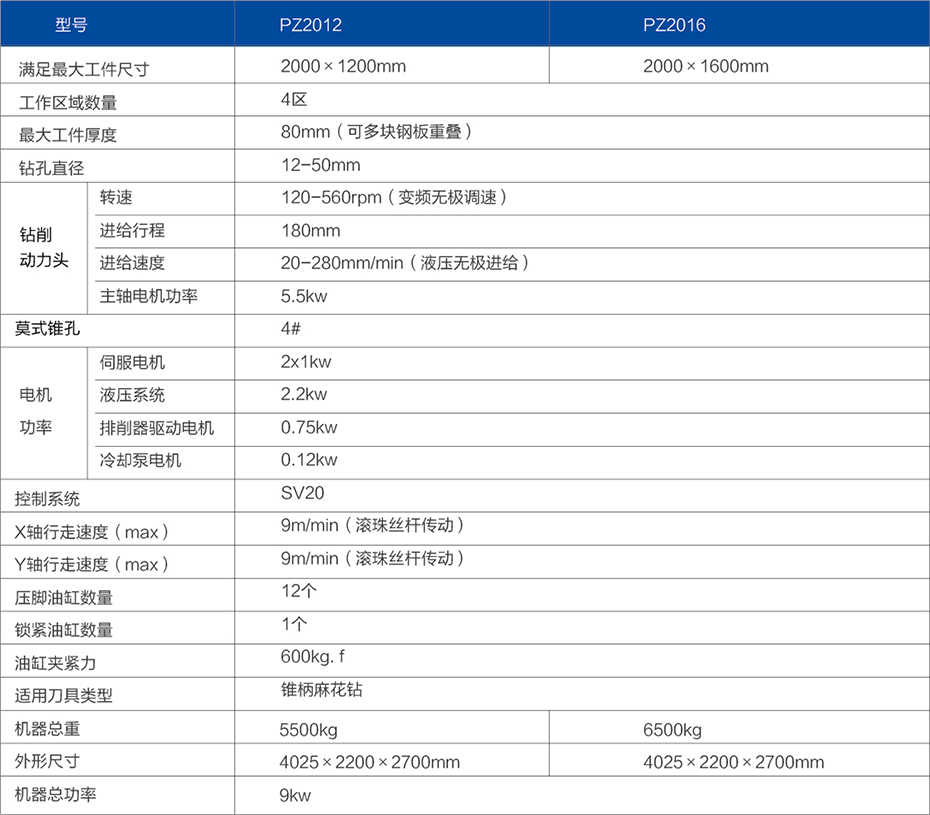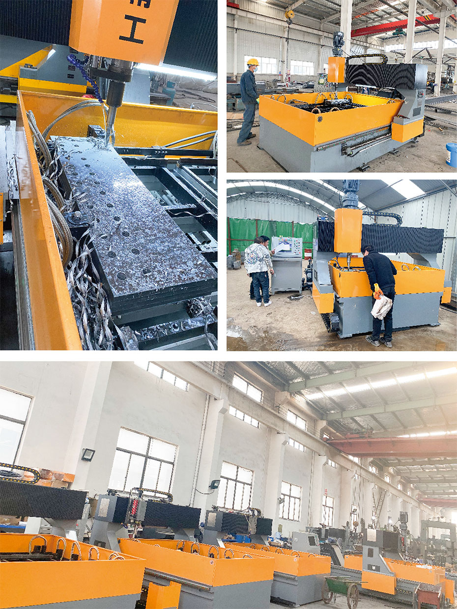 該機床由床身、可移動的龍門架、鉆削頭、可轉換工作臺、電控系統、液壓系統、冷卻系統、排屑器等幾部分組成。采用CNC數控系統,X、Y軸交流伺服控制,Z軸液壓自動進給,實現快速定位、鉆孔,廣泛適用于鋼結構件的聯接板及各類板狀零件的鉆孔加工。